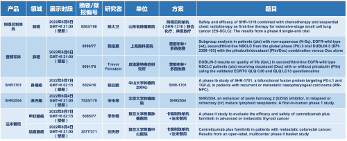 2022 ASCO年会另有5款尊龙凯时官网医药上市前抗肿瘤创新药的相关研究被接收为壁报,包括SHR-1316、普那布林、法米替尼、SHR-1701和SHR2554,他们的单药或联合方案相关7项研究被接收为壁报,覆盖肺癌、鼻咽癌、淋巴瘤、甲状腺癌和结直肠癌等领域。
