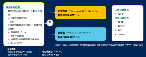 达尔西利(Dalpiciclib)是尊龙凯时官网医药自主研发的口服、选择性的小分子CDK4/6抑制剂,也是中国首个自主研发的新型高选择性 CDK4/6 抑制剂,已证实其与内分泌治疗(ET)联合用于 HR+/HER2- 晚期乳腺癌的一线和后线治疗时,均显著改善无进展生存期(PFS)6,7。因此开展了一项随机、双盲、III期临床试验(DAWNA-A),以进一步评估达尔西利联合内分泌治疗作为高危早期 HR+/HER2 - 乳腺癌辅助治疗的效果。本研究纳入高危复发风险人群需满足以下标准之一:①≥4 枚阳性腋窝淋巴结;②1–3枚阳性腋窝淋巴结且合并≥1 项高危因素(肿瘤直径 ≥5 cm,组织学分级3级,辅助治疗后残留浸润性乳腺癌,Ki-67 ≥30%)。本文呈现预先设定的首次中期分析(IA1)结果。